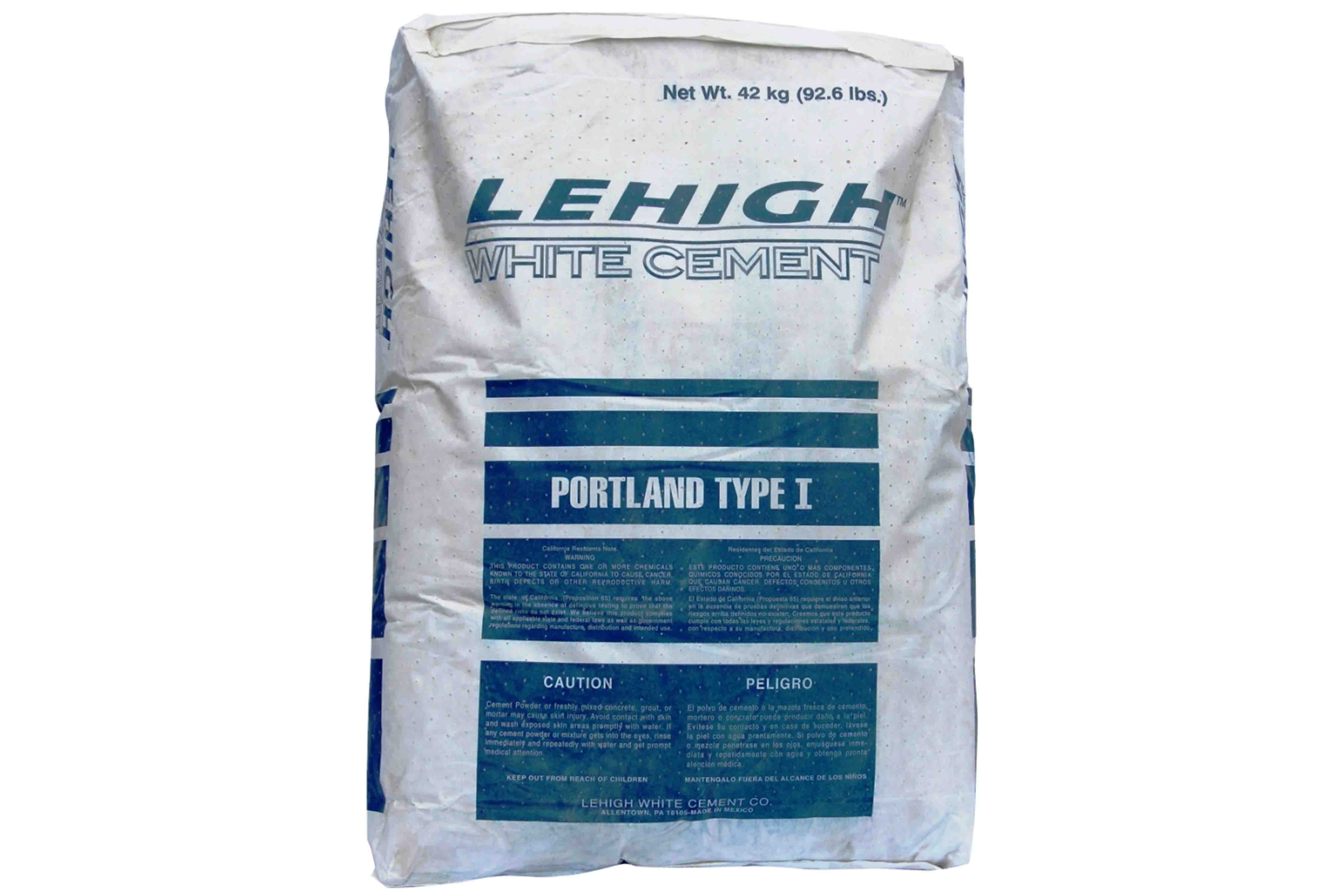 Lehigh White Type I meets ASTM C150 Standard Specification for Portland Cement. Uses: precast and prestressed architectural concrete, cast-in-place architectural and structural concrete, architectural concrete masonry, swimming pools and spas, colored mortars, ornamental statuary, reflective floors, floor tiles and pavers, cast stone, terrazzo, tile grout, glass fiber reinforced concrete products, concrete countertops, concrete roof tiles, traffic calming and delineation, median barriers, bridge parapets, sound walls, retaining walls, tunnel construction, reflective concrete paving. Available in 42 kg (92.6 lb.) bags, and in bulk truckload quantities.